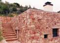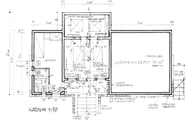 Παλλήνη Αττικής Για ένα κτήμα 9 στρεμμάτων με τη φύτευση σε εξέλιξη και σκέψεις δημιουργίας στο μέλλον χώρου εκδηλώσεων, μελετήθηκε και κατασκευάστηκε ως πρώτη φάση επέμβασης το έργο της υποδομής. Αυτό περιέλαβε δεξαμενή νερού, μηχανοστάσιο, αποθήκη, μικρό χώρο διανυκτέρευσης με λουτρό και διαμόρφωση περιβάλλοντος χώρου, περίφραξη, είσοδο βαρέων οχημάτων κ.λπ. Όλοι οι στεγασμένοι χώροι και η δεξαμενή ενσωματώθηκαν σε ένα και μόνο κτίριο που τοποθετήθηκε κατά μήκος φυσικού αναγλύφου, ώστε να είναι κατά το μεγαλύτερο μέρος του θαμμένο στο έδαφος. Κύριο θέμα είναι ο φυσικός λίθος, ημικατεργασμένος για το κτίριο, ακατέργαστος για τις περιφράξεις και τον υπαίθριο χώρο ή συνδυασμός τους. Χρησιμοποιήθηκαν και πολλά αυτούσια αγκωνάρια λατομείου, ενώ τα μονοπάτια και ρυάκια αποχέτευσης ομβρίων εντός του κτήματος έγιναν με διάσπαρτες πέτρες φυτευτές, από αυτές που προϋπήρχαν εκεί. Το δίκτυο των ηλεκτρομηχανολογικών εγκαταστάσεων είναι υπόγειο με επισκέψιμο κανάλι, καθώς και πρόβλεψη επέκτασης. Υλικά: Φυσικός λίθος κόκκινος, εμφανές μπετόν βαμμένο και σίδηρος μασίφ χρώματος μαύρου.