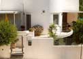 Ο υπαίθριος χώρος σχεδιάστηκε και μορφολογήθηκε ως αναπόσπαστο τμήμα του εσωτερικού και για τα δύο επίπεδα διαμορφώνοντας ένα ενιαίο σύνολο. Ο φέρων οργανισμός καθώς και οι δομικές διαμορφώσεις του υπαίθριου χώρου είναι από οπλισμένο σκυρόδεμα , οι τοίχοι από τούβλο ,τα κουφώματα από αλουμίνιο ,ενώ οι πέργκολες και τα κιγκλιδώματα από σίδηρο. Τρία χρώματα κυριαρχούν : λευκό για τα δομικά στοιχεία, τα κουφώματα και τις πέργκολες ,ανοικτό κεραμιδί για τα δάπεδα μέσα και έξω και γκρι για τα μεταλλικά στοιχεία. Ως τελικό αποτέλεσμα εμφανίζεται μια μικρογραφία βίλλας με ανάλαφρη αίσθηση ,ενταγμένη στο τοπίο ενώ τα ζεστά καλοκαίρια των Χανίων δεν ταράζουν την μεσημεριανή ξεκούραση των κατοίκων της.